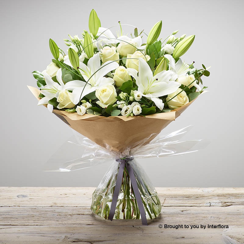 Our caring florists have designed Wonderfully White Sympathy Hand-tied using elegant white flowers including ivory roses, white lilies and lisianthus. Perfectly complimented with green foliage, our flower team carefully wrap in kraft paper and tie with ribbon.